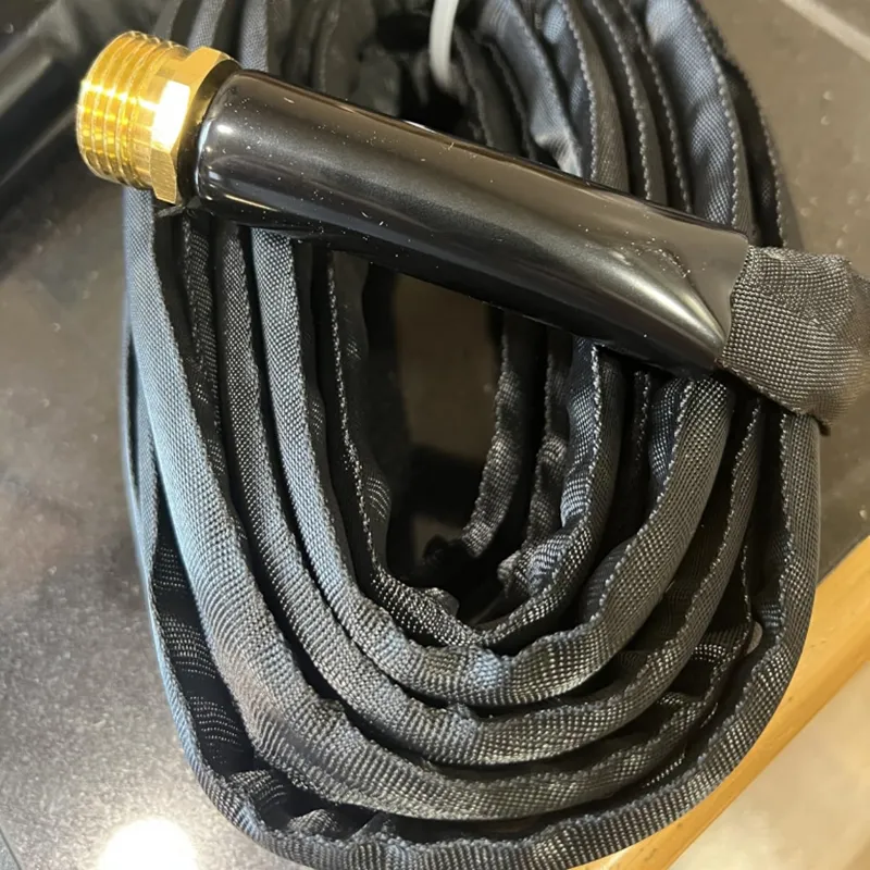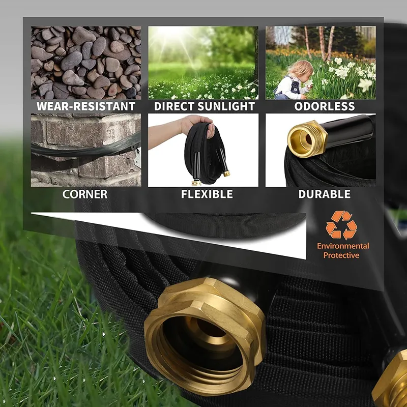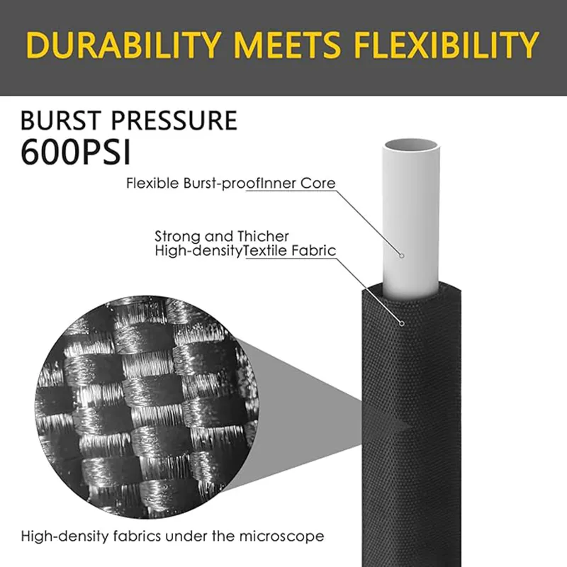 【 High-Quality Materials】Garden hose is constructed with sturdy marine-grade material, This water hose Crafted from thickened PVC inner tube and high-density abrasion-resistant textile material, ensures minimal tangling or bursting. The unique PVC inner tube boasts high strength and pressure resistance, capable of withstanding higher water pressures to prevent unexpected ruptures. Meet your gardening needs for everyday use, We US. American standard brass Connector(Not Aluminum Connector).