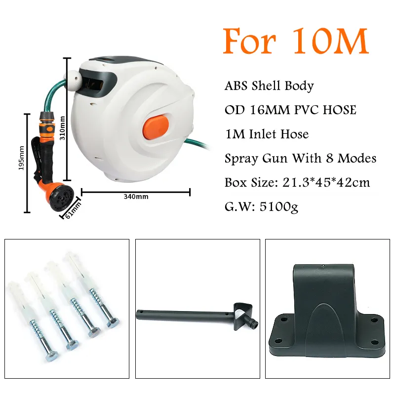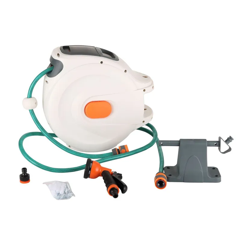 Rotating Bracket: The hose reel is equipped with a rotating bracket that mounts securely to a wall, allowing for 180 degree rotation. This feature caters to multi-directional watering requirements.