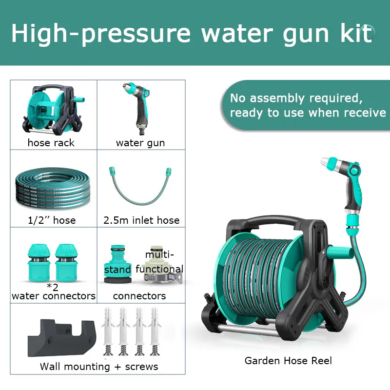 FULLY ASSEMBLED: the hose reel kit is equipped with garden hose holder, hose, adjustable nozzle, supply hose and various adapters; all accessories and water pipes are installed at the time of shipment, and only need to be connected to the handle to use, eliminating the trouble of installation after receiving the goods.