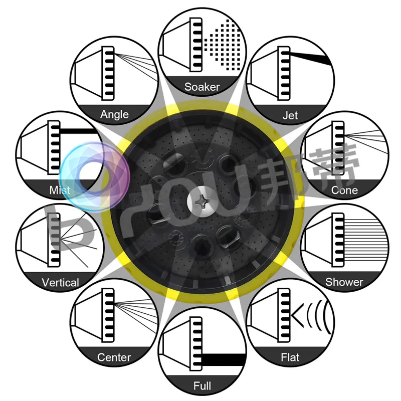 10 Spray Nozzles Water Gun: Accept color customization, including flat, full, center, jet, mist, shower, vertical, 1/2 vertical, cone, angle, rotating the spray cap to select the mode.